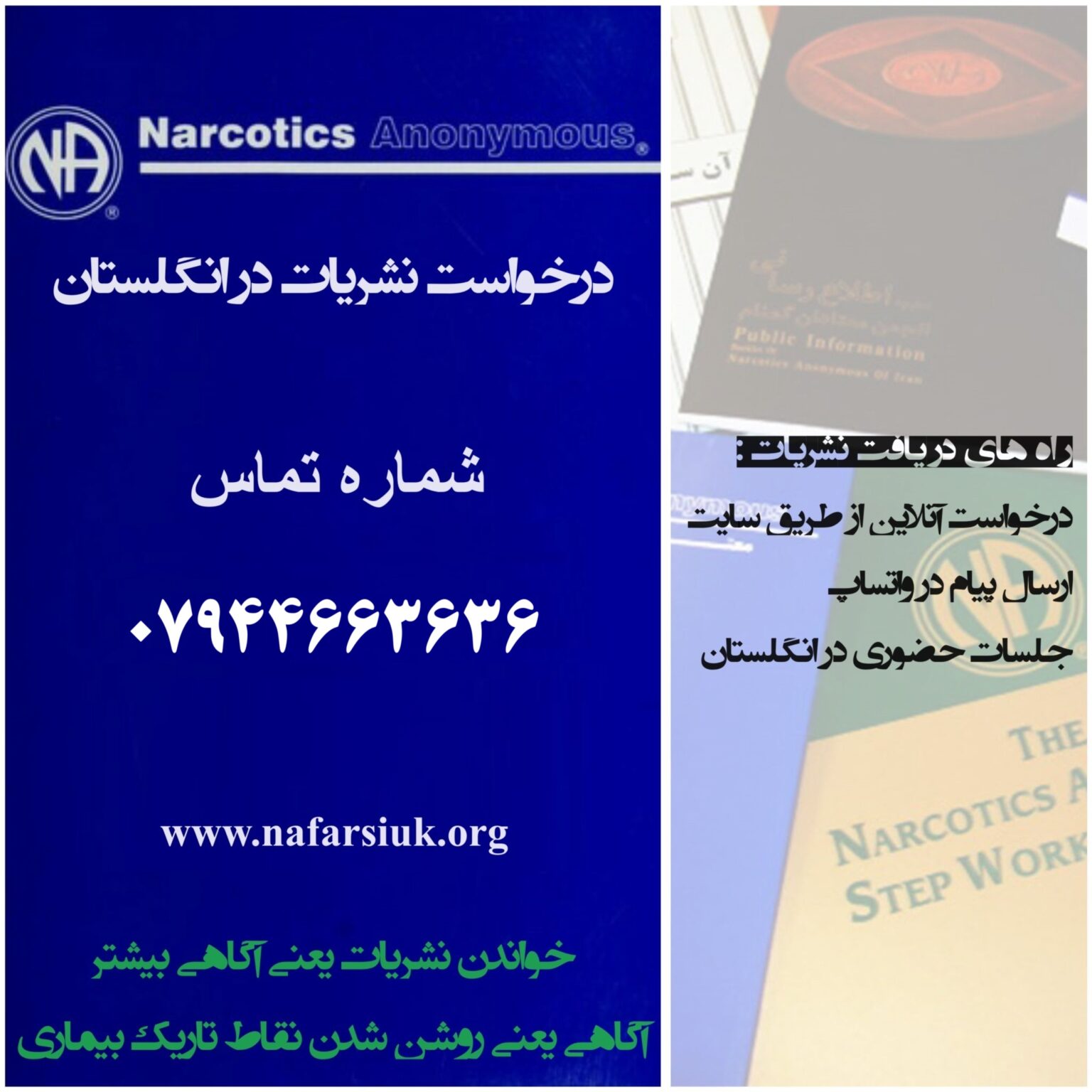 اگر مواد مخدر در زندگی شما مشکل ایجاد کرده NA می تواند به شما کمک کند.NA صرفا به کمک اعضایی متکی است که به همدیگر کمک می کنند تا از مصرف مواد مخدر پاک بمانند و بتوانند پاکی خود را حفظ کرده و روش زندگی کردن بدون مصرف مواد مخدر را در بهبودی تجربه کنند NA رایگان است و شرکت در جلسات بهبودی هیچ هزینه ای در بر نخواهد داشت.شاید شما قبلادر مورد NA چیزهایی شنیده باشید، یا اینکه این اولین باری است که NA را مد نظر قرار می دهید.در هر صورت ما به شما توصیه می کنیم تا در یکی از جلسات ما شرکت کنید ، و معتادان در حال بهبودی را از نزدیک ملاقات کنید و خودتان در یابید که آیا ما چیزی برای ارایه به شما داریم.