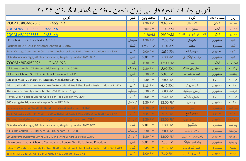 آدرس جلسات معتادان گمنام فارسی زبان انگلستان انتخاب شهر لطفا انتخاب کنید جلسات آنلاینشفیلدگلاسکونیوکاسلبیرمنگام منچسترلندنلیورپوللیدزناتینگهام ایام هفته لطفا انتخاب کنید شنبهیکشنبهدوشنبهسهشنبهچهارشنبهپنجشنبهجمعه جستجو دانلود کل آدرس جلسات