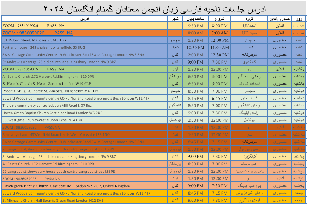 آدرس جلسات معتادان گمنام فارسی زبان انگلستان انتخاب شهر لطفا انتخاب کنید نیوکاسلبیرمنگام جلسات آنلاینمنچسترلندنشفیلدلیورپوللیدزناتینگهام ایام هفته لطفا انتخاب کنید شنبهیکشنبهدوشنبهسهشنبهچهارشنبهپنجشنبهجمعه جستجو دانلود کل آدرس جلسات